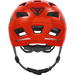 Ce casque vélo Abus Hyban 2.0 Signal bénéficie d'une construction particulièrement solide. Il utilise une coque extérieure très dure en matériau ABS et une bonne épaisseur de mousse absorbante EPS (polystyrène expansé), pour bien amortir le coup en cas de mauvais choc. La coque recouvre bien la tête, les tempes et la zone occipitale.