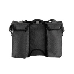 Le compartiment principal est immense ! Il vous permet de ranger tout le nécessaire pour un bike trip d'un week-end, vêtements, chaussettes, duvet, trousse de toilette et autre matériel de bivouac. Avec son super gabarit et ses rangements adaptés, cette sacoche permet aussi de faire face aux grosses journées en semaine. Vous pouvez glisser votre ordinateur portable dans l'espace matelassé, le chargeur dans la poche zippée, vos affaires de sport dans le grand compartiment, avec votre repas de midi. Vous avez encore des poches porte-bidon (arrière), des poches stretch mesh (latérales), une poche extérieure zippée, des sangles externes pour bloquer un casque, une veste ou un poncho.