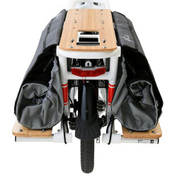 Cette paire de sacoches Yuba 2-Go s'installe facilement sur la plateforme arrière de votre Sweet/Spicy Curry, au moyen d'une simple clé Allen. La fixation se fait au niveau du pont central, qui relie les deux sacoches. Le maintien des sacoches est assuré par des liens élastiques sur la structure inférieure du cadre.