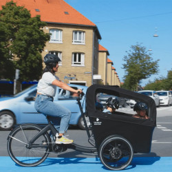 Le triporteur électrique Boxter CL présente un cadre en aluminium puissant et élégant. Avec sa base incurvée, il s'enjambe sans difficulté. La position au guidon est détendue et vous pouvez régler l'angle de la potence pour vous ajuster. La marque danoise utilise un design anti basculement très sécurisant. Les roues avant de 20" sont légèrement inclinées vers l'extérieur pour bien stabiliser le vélo, tandis que le cadre décrit un léger mouvement vers l'intérieur à chaque virage. Cette conception unique renforce la qualité de conduite.