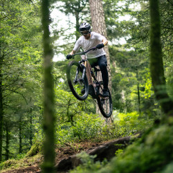Le VTT électrique Moustache Samedi 29 Game 160.9 domine la gamme VTT Enduro chez Moustache. On l'a vu, il propose la plus grande capacité de batterie Bosch disponible (750 Wh), des suspensions Fox de première classe (Factory) et des roues Moustache en carbone. La reste de l'équipement se maintient au très haut niveau. Fox fournit encore sa tige de selle télescopique Transfer. Sram s'occupe de la transmission avec son dérailleur électronique 12V X0 Eagle AXS, qui éclipse tous les systèmes mécaniques sur la rapidité et la douceur des changements de vitesse. Shimano se charge du freinage avec ses puissants étriers XT 4 pistons. Les jantes Moustache accueillent des pneus Maxxis Assegai redoutables sur le terrain, avec une qualité de grip difficile à prendre en défaut.