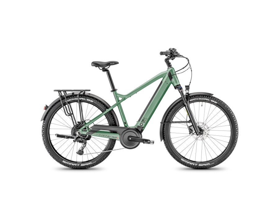 Moustache vous propose un porte-bagages arrière, qui est prêt à recevoir des sacoches QL3 ou un siège bébé MIK HD. Visible à 400 m, le feu arrière est monté sur le garde-boue. Le phare compact AXA de 30 lux est fixé au niveau de l'arceau de la fourche.