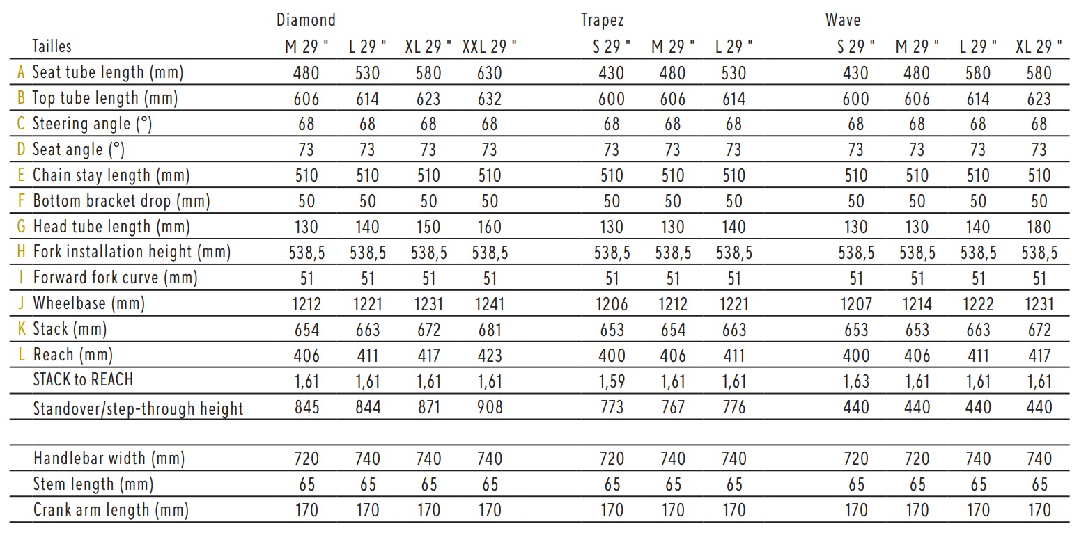 | Taille cadre | S (29") | M (29") | L (29") | XL (29") | XXL (29") |