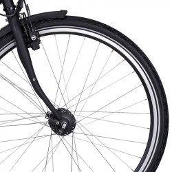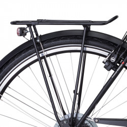 On apprécie l'ensemble complet d'accessoires qui l'équipent d'origine : des garde-boue SKS protecteurs par temps de pluie, un porte-bagages arrière Racktime pratique, un set d'éclairages B&M, avec un phare avant alimenté par le moyeu à dynamo.